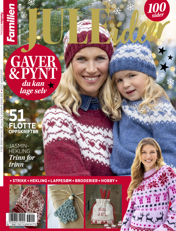 En 100-siders julespesial fra Familien, full av inspirasjon til årets hyggeligste høytid. Her finner du den fineste pynten du kan lage selv, gode gavetips og masse herlige håndarbeid til adventstiden. I Juleideer får du oppskrifter på ting du kan strikke, hekle, brodere, lage eller sy til deg selv eller andre.